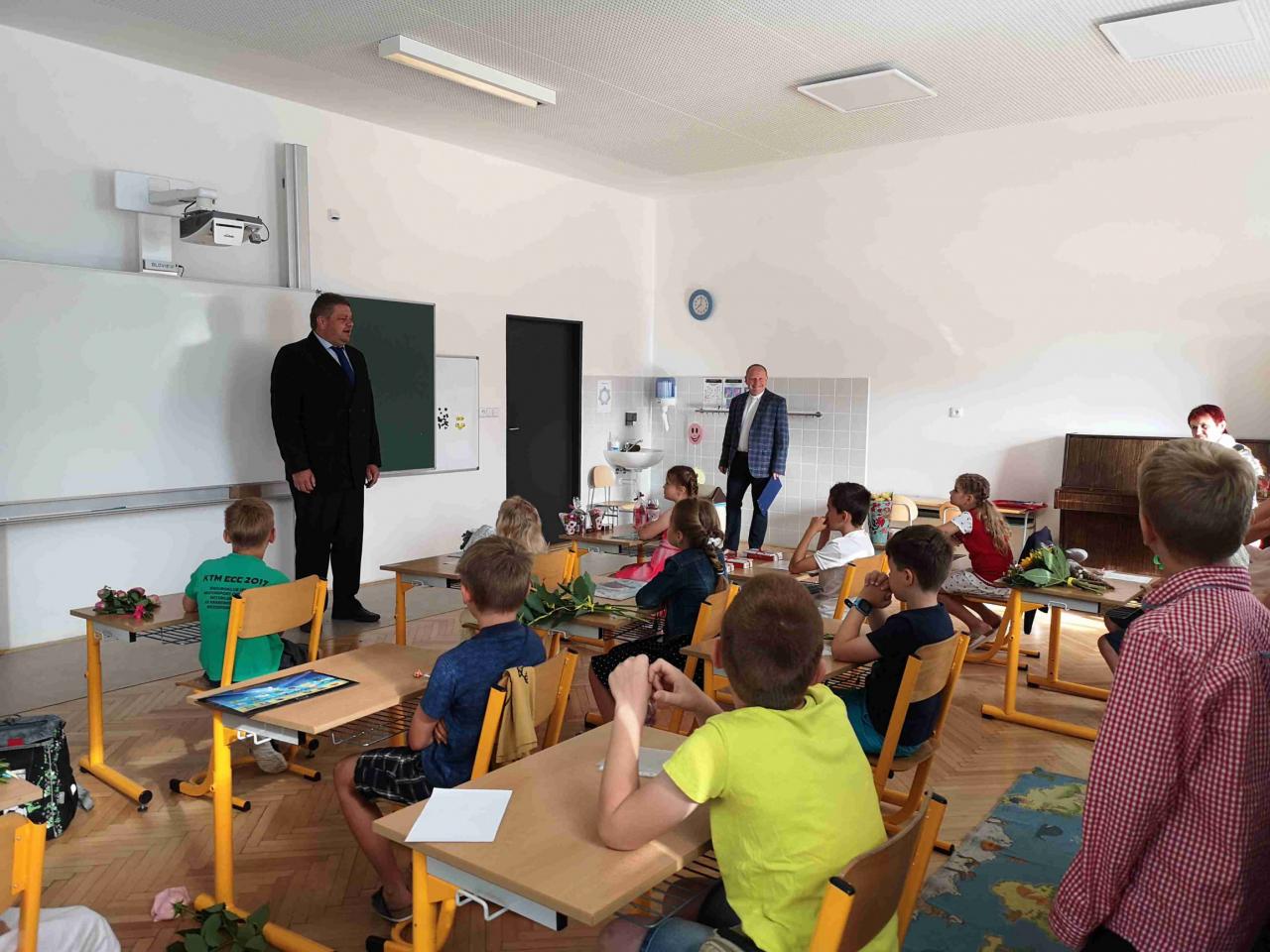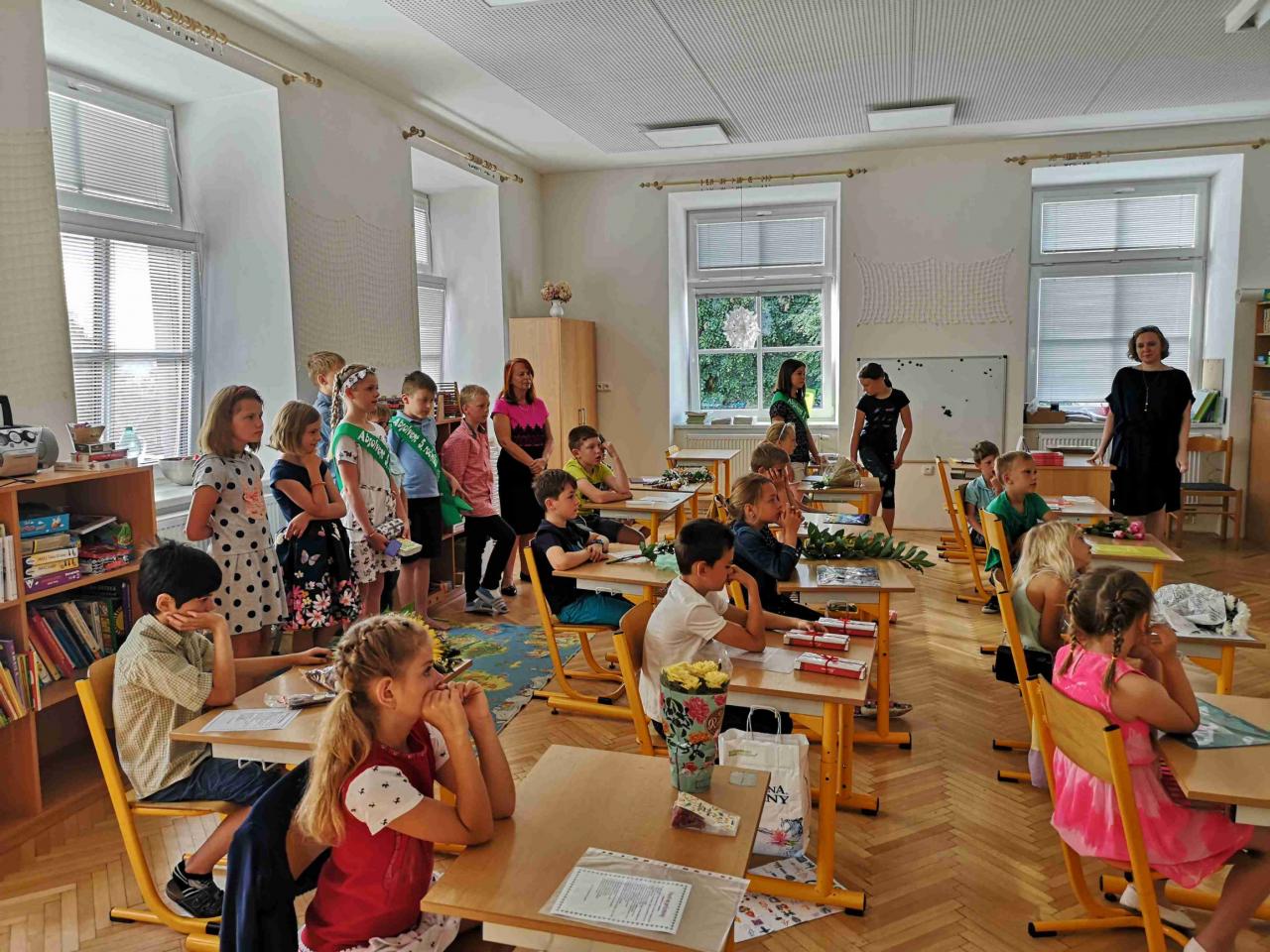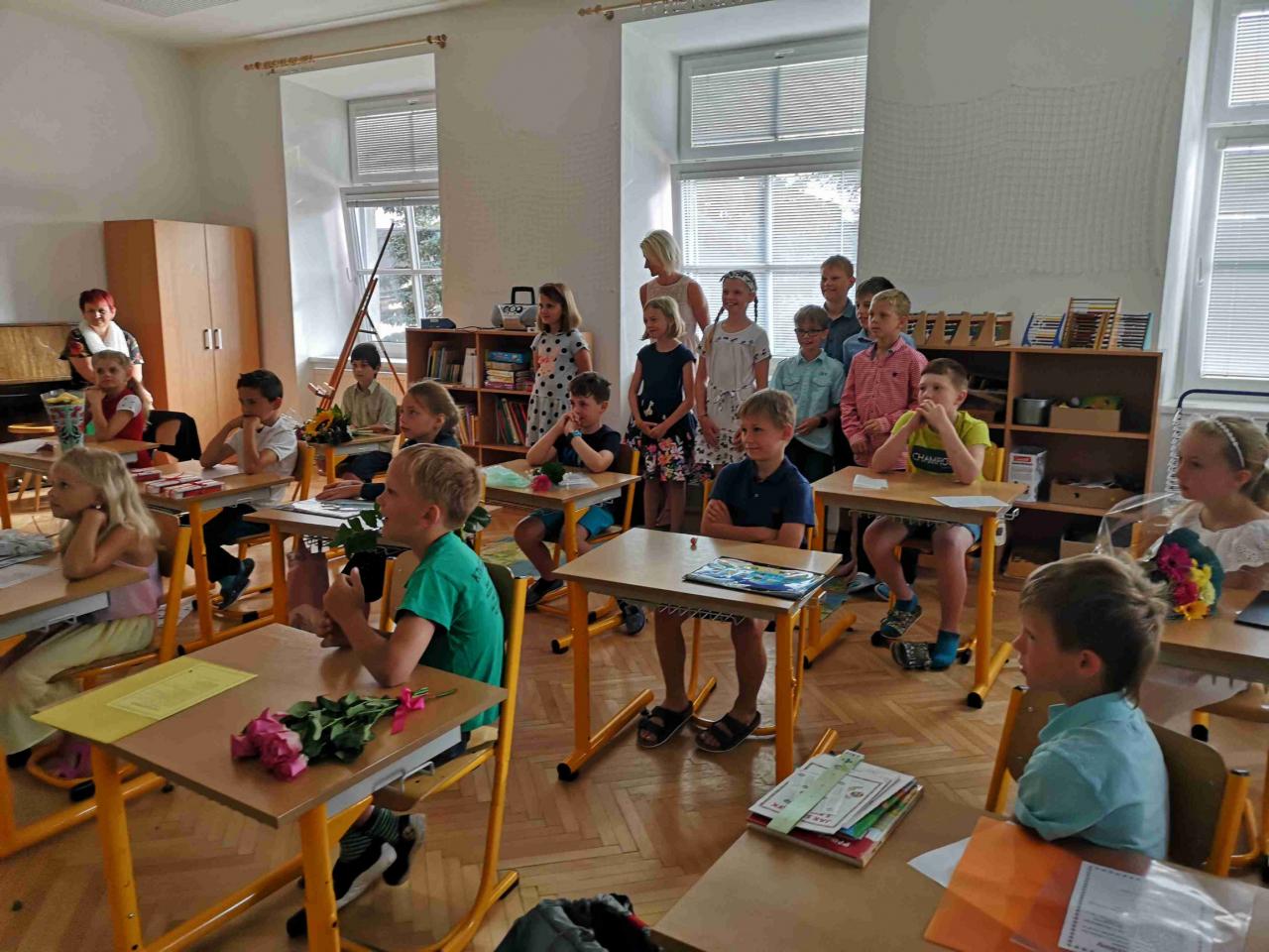 Krásná slova na rozloučenou před dvěma měsíci volna od pana starosty, pana faráře a paní ředitelky, ošerpování páťáků, rozdání vysvědčení, předání květin a hurá! Jsou tady prázdniny.